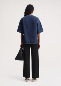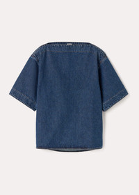 TOTEME top with a wide torso and arms reminiscent of kimonos. It's made from mid-weight, lightly washed organic-cotton denim with a neat straight neckline and dropped shoulders defined with contrast stitching. Balance the boxy frame with fluid trousers. Details and fit - Dark blue - Darted straight neckline - Slip on - 100% Organic cotton - 30°C Machine wash - Style number 233-5066-741 - The model is 176cm/5'9'' tall and wears a size 34 - Designed for a boxy fit, those with a petite frame may wish to take a size down