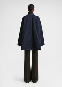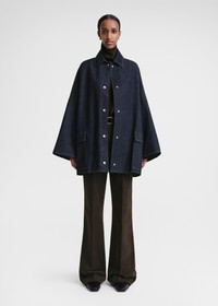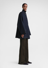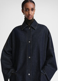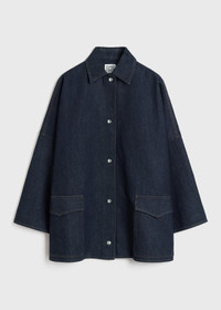 TOTEME overshirt jacket made in Italy from mid-weight, rigid cotton denim. It's cut to an extra-oversized A-line silhouette that fits loosely around the chest and waist and features dropped shoulders, spacious flap pockets and silver snap buttons to fasten. Slip it over weekend looks. Details & Fit - Raw blue - Silver-tone snap buttons - Flap pockets - 100% Organic cotton - 30°C Machine wash; avoid rubbing against light-colored fabrics and surfaces as some discoloration will occur - Style number 241-WRO1050-FB0045 - The model is 179cm/510 tall and wears a size S - Very oversized fit, consider taking one or two sizes down