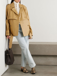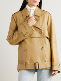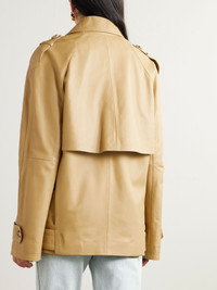 TOTEME re-imagines the classic trench in cool, unexpected proportions, with a relaxed fit and longer hem. This jacket is made from supple leather in a double-breasted design and has traditional elements, including shoulder epaulettes, cuff tabs and a belt. Size & Fit TOTEME follows its own size guide, please refer to below: - DK 32 = UK 4/ US 0/ IT 36 - DK 34 = UK 6/ US 2/ IT 38 - DK 36 = UK 8/ US 4/ IT 40 - DK 38 = UK 10/ US 6/ IT 42 - DK 40 = UK 12/ US 8/ IT 44 - DK 42 = UK 14/ US 10/ IT 46 - Fits true to size, however those who are between sizes should take the smaller size - Designed for a relaxed fit, use the belt to cinch in at the waist - Mid-weight, non-stretchy fabric - Model is 175cm/ 5'9" and is wearing a DK 34 Model measurements: - Bust: 79cm/ 31" - Waist: 63cm/ 25” - Hip: 90cm/ 35.5” Details & Care - Sand leather - Button fastenings through double-breasted front - 100% leather (Lamb); lining: 100% viscose - Dry clean