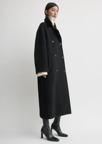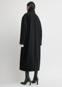 Effortless coat designed to envelop the body and offer comforting cover against the elements. Made from a brushed wool blend, it has a clean collar followed by a long, oversized silhouette with a double-breasted button front. Style it with the collar up. Details - Black - Button front - Welt pockets - Satin lining, internal pocket - 70% Wool Recycled, 25% Polyamide Recycled, 5% Cashmere Recycled - Dry clean - Style number 254-WRO0231-FB0532 Fit information - The model is 180cm/5'11” tall and wears a size 36 - Slouchy fit Origin & Certificates - Country of origin: Romania - Manufacturer: SC Simiz Fashion SRL