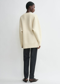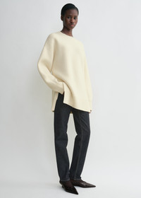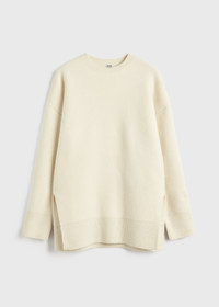 Longline TOTEME crew-neck sweater double-knitted to an inverted trapeze silhouette with low and spacious armholes channeling a relaxed mood. It is made from certified wool infused with a soft touch of cashmere and has a discreet monogram embroidered onto the sleeve. Note how the side-hem slits allow it to drape effortlessly over the hips. Details & Fit - Snow - Embroidered monogram - Side-hem slits - 88% wool RWS, 8% cashmere, 4% polyamide - Cool hand wash - Style number 251-WRT4626-YA0132 - The model is 178cm/510 tall and wears a size S - Oversized fit, tapered silhouette