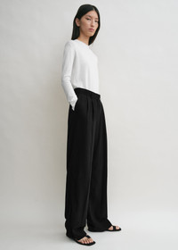 High-rise TOTEME suit trousers with a classic tailored construction draping effortlessly down the straight legs. Crafted in Portugal, they feature a structured waistband with belt loops, side back pockets and a zipper fly. Keep the front pleats in focus by wearing them with a tucked-in top. Details & Fit - Black - Belt loops - Side and back pockets - Zipper fly - 40% viscose, 38% viscose ecovero, 13% wool, 9% viscose circulose - Dry clean - Style number 252-WRB0289-FB0378 - The model is 180cm/5'11 tall and wears a size 36 - True to size, straight legs