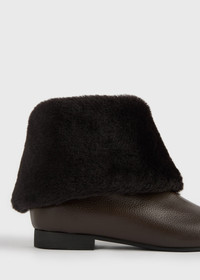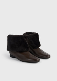 Building on the Satin ankle boots unveiled at the Fall Winter 25 runway, this directional winter pair is made from grained leather lined with warm shearling – keep it in focus by opening the side zipper and folding down the top edge. Details & Fit - Brown - Brown shearling trim - Leather lining, insole and sole - Rounded block heel - 100% calf leather; insole: 100% lamb leather; sole: 100% cow leather - Care instructions and dust bag included - Style number 261-WAS0264-LE0051 - True to size