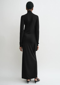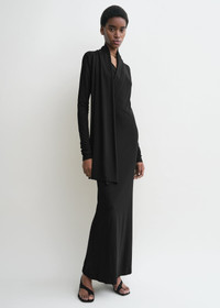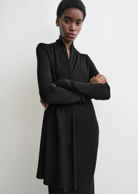 TOTEME dress with a matching scarf attached at the neck that drapes effortlessly over the overlapped front. It is made from fluid viscose jersey with a touch of elastane for a body-hugging fit. Style it with a confident belt. Details & Fit - Black - Attached scarf - 96% viscose, 4% elastane - Cool hand wash - Style number 252-WRD0172-FB0162 - The model is 178cm/510 tall and wears a size S - Regular fit, true to size