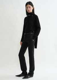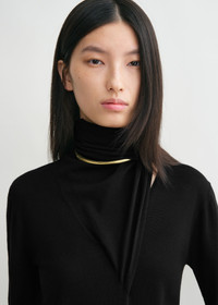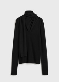 Fine TOTEME sweater top with an extra-long, attached scarf that wraps around the neck for sculptural draping and movement. It is knitted from light merino wool and silk to a slim silhouette that can be complemented with the matching skirt. Details & Fit - Black - Attached scarf - 75% wool RWS, 25% silk - Cool hand wash - Style number 244-WRT0393-YA0087 - The model is 180cm/5'11 tall and wears a size S - True to size, slim fit