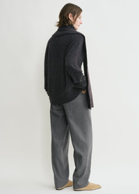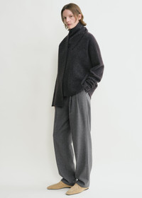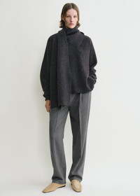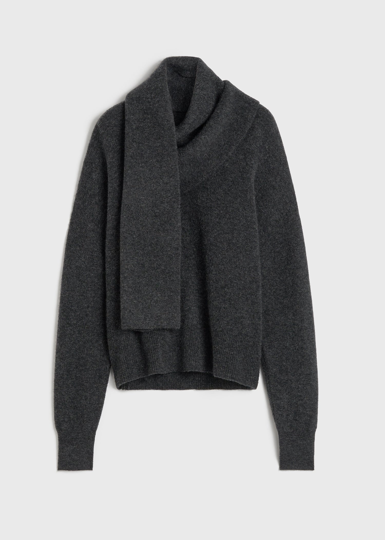 Boxy TOTEME sweater featuring an attached scarf that wraps around the neck for sculptural draping. It is knitted from a warm and cozy blend of recycled polyamide, wool and yak fibers with a touch of elastane and is finished with ribbed edges. Let the scarf drape effortlessly over one shoulder. Details & Fit - Granite - 42% polyamide, 39% wool, 17% yak, 2% elastane - Cool hand wash - Style number 244-WRT0368-YA0099 - The model is 178cm/510 tall and wears a size S - Slightly oversized fit, boxy shape