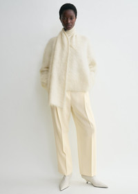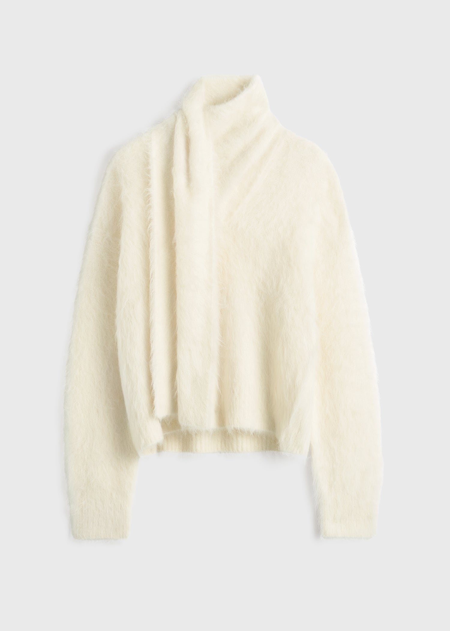 Boxy TOTEME sweater featuring an attached scarf that wraps around the neck for sculptural draping. It is knitted from warm, cozy and hairy alpaca fibers blended with recycled polyamide and a touch of elastane for a comfortable fit. Team it with tonal trousers for a monochromatic result. Details & Fit - Ivory - 78% alpaca, 20% polyamide recycled, 2% elastane - Cool hand wash - Style number 251-WRT0368-YA0106 - Boxy fit, long sleeves - The model is 176cm/59 tall and wears a size S