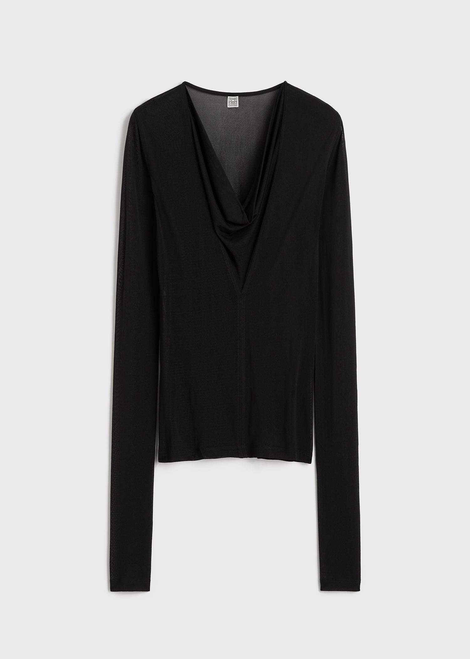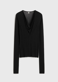 TOTEME top knitted from semi-sheer crepe jersey as a nod to the season's transparency theme. It has a deep V-neckline with a sewn-in panel that drapes like a cowl neckline and is framed by extra-long sleeves that slouch at the wrists. Tuck it into tailored trousers. Details & Fit - Black - 100% viscose - Cool hand wash - Style number 244-WRT0401-FB0266 - The model is 180cm/5'11 tall and wears a size S - True to size, slim fit