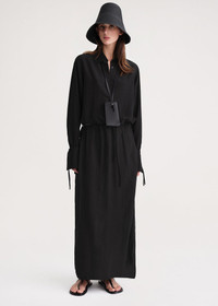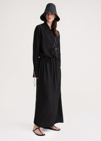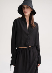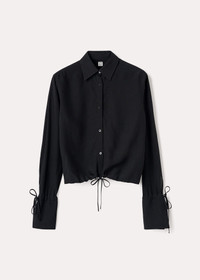 TOTEME shirt made from mid-weight and softly crinkled viscose blended with a touch of silk. It's designed for a cropped, boxy silhouette that puffs up when the drawstrings at the waist and long cuffs are pulled. Wear it for anything from work to the beach. Details and fit - Black - Button front - Drawstrings at waist and cuffs - 88% Viscose, 12% silk - Cool hand wash - Style number 232-5046-205 - The model is 179cm/5'9" tall and wears a size 34 - True to size