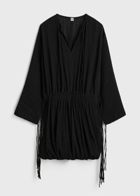 TOTEME summer dress decorated with drawstrings at the neck, cuffs and waist, creating sculptural volumes. It is crafted from crinkled organic cotton with ample batwing sleeves and a billowing skirt that is twisted for movement. Add sunglasses and flip flops for a seaside lunch. Details & Fit - Black - Neck, cuff and waist drawstrings - Dropped waist - Twisted skirt - Light, semi-sheer and crinkled fabric - 100% cotton organic - Dry clean - Style number 253-WRD0190-FB0370 - The model is 176cm/59 tall and wears a size 36 - True to size, adjustable waist