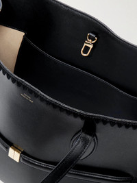 TOTEME's tote has a generous rectangular shape outlined with whipstitched trims and has a tonal belt threaded through the center. It's made from smooth leather and offers enough space for your wallet, sunglasses and few makeup essentials. Details & Care - Black leather (Cow) - Top handles - Internal slip pocket - Suede lining - Clasp fastening at open top