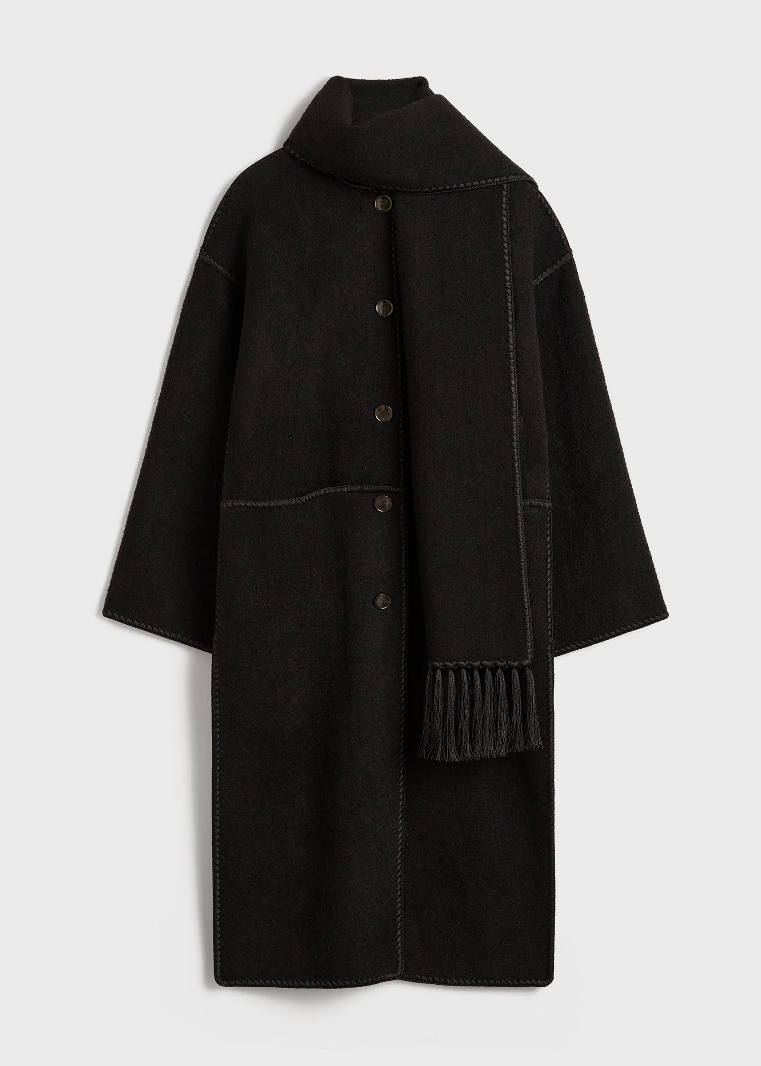 TOTEME Embroidered scarf jacket reworked into an oversized coat with an attached scarf that wraps elegantly around the neck. It is made from a heavyweight wool blend with artisanal blanket stitching and lustrous tassels, then complete with spacious pockets and a buttoned front. Wear it when out and about in the city. Details & Fit - Black - Attached scarf, button front - Spacious pockets - High side slits - 68% wool RWS, 20% wool recycled, 12% polyester recycled - Dry clean - Style number 244-WRO0131-FB0292 - The model is 180cm/5'11 tall and wears a size 36 - Oversized fit, wide sleeves