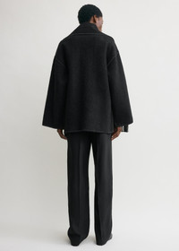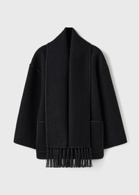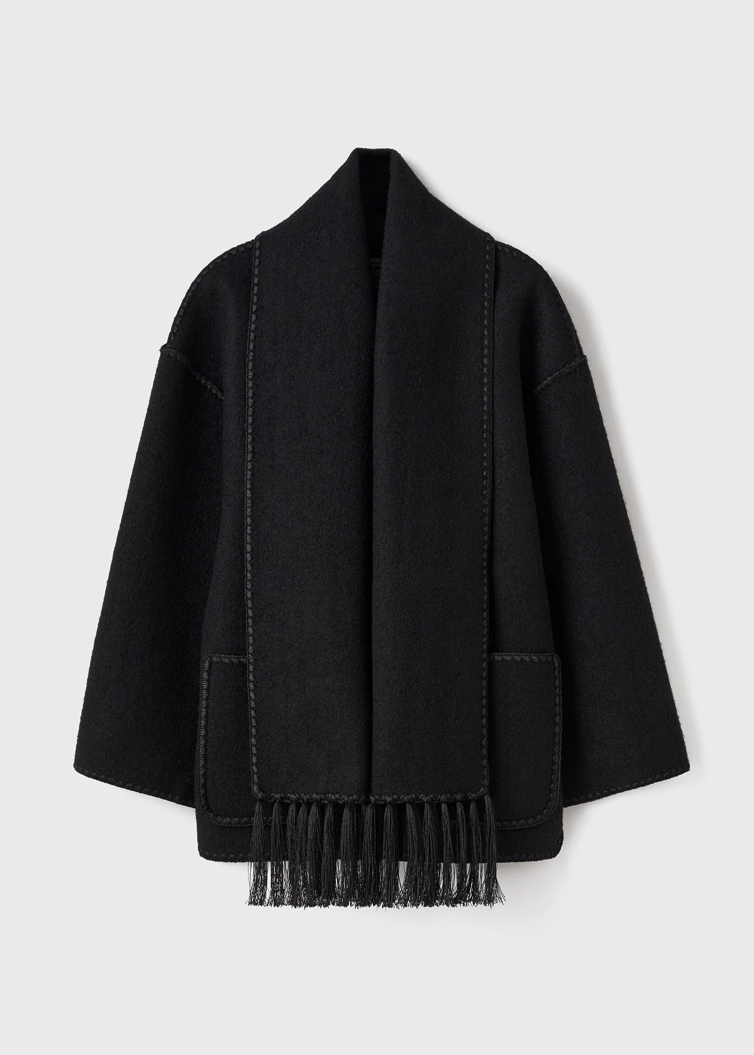 TOTEME coat jacket with an attached scarf that's embroidered along the edges for an artisanal finish. It’s made from heavy and structured wool-blend felt certified by the Responsible Wool Standard and designed for an oversized fit with dropped shoulders, wide sleeves with slits, and patch pockets. Complement the hip-grazing length with straight trousers. Details & Fit - Black - Button front - Patch pockets - 88% Wool, 12% polyester - Dry clean - Style number 224-1018-201 - Designed for an oversized fit. Take your usual size for the intended look or go down a size for a neater look - The model is 180cm/510 tall and wears a size 36