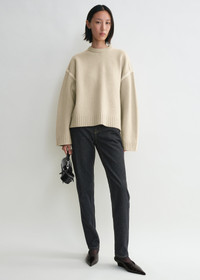 Wide sweater inspired by TOTEME's Embroidered scarf jacket. It is knitted from mid-weight wool with a touch of cashmere for warmth and softness, then is embroidered along the shoulders and armholes with contrasting thread, offering an artisanal twist on everyday knitwear. Team it with the matching scarf for a statement winter look. Details & Fit - Harvest - 90% wool RWS, 10% cashmere - Cool hand wash - Style number 241-WRT1025-YA0004 - Oversized, boxy fit - The model is 180cm/5'11 tall and wears a size S