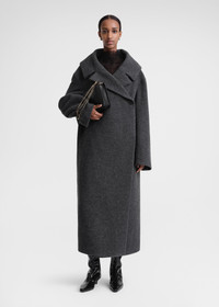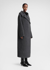 Statement TOTEME coat with an oversized wrap silhouette and a structured open neckline. Made from heavy and spongy wool-blend felt and fully lined in viscose satin, it has a concealed button front, side slip pockets and an internal pocket to keep essentials at hand. Wear it with occasion looks. Details & Fit - Dark grey mélange - Concealed button front - Slip pockets, internal pocket - Grey satin lining - 50% Wool, 30% recycled wool, 20% polyamide; lining: 100% viscose - Dry clean - Style number 241-WRO979-FB0055 - The model is 179cm/5'10" tall and wears a size 36 - True to size, relaxed fit