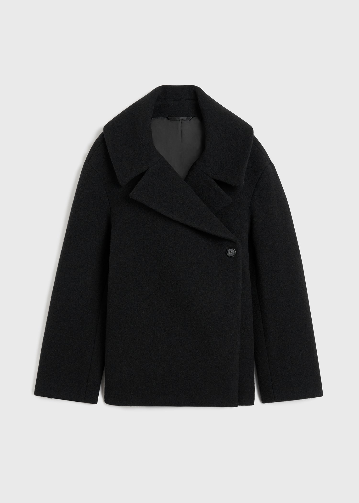 Statement TOTEME jacket with an oversized wrap silhouette and a structured open neckline. Made from heavy and spongy wool-blend felt and fully lined in viscose satin, it has a concealed button front, side slip pockets and an internal pocket to keep essentials secure. Wear it to stay warm during a daytime stroll. Details & Fit - Black - Concealed button front - Slip pockets, internal pocket - Grey satin lining - 50% Wool, 30% recycled wool, 20% polyamide; lining: 100% viscose - Dry clean - Style number 241-WRO981-FB0055 Wool Blend Black 001 - The model is 175cm/59 tall and wears a size 36 - True to size, relaxed fit