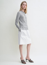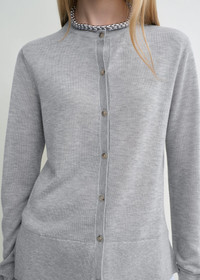 Crew-neck TOTEME cardigan revisited in a subtle melange pattern. It is finely knitted from Lyocell and cashmere fibers to be light yet warm and features a buttoned front and tonal monogram embroidery. Discreet side slits drape effortlessly over the hips. Details & Fit - Grey - Embroidered monogram - Front buttons - Side slits - Light and fresh knit - 90% lyocell, 10% cashmere - Cool hand wash - Style number 243-WRT0329-YA0079 - The model is 178cm/510 tall and wears a size 36 - True to size, regular fit