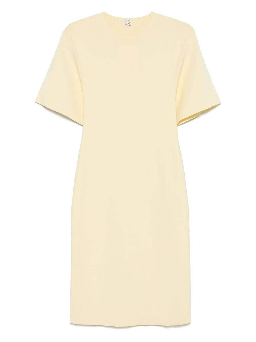 fine-knit midi dress Highlights - Light yellow - Crew neck - Short sleeves - Below-knee length Imported Composition Viscose 53%, Recycled Polyamide 45%, Elastane 2% SIZE & FIT Model measurements Height 5 ft 11 in(1.8 m) Bust/Chest 31.49 in(80 cm) Hips 35.82 in(91 cm) Waist 24.8 in(63 cm) FittingInformation Designed for a slim fit that sits just away from the body offering a close yet comfortable fit Made from a midweight stretch fabric, this piece offers elasticity and flexibility when worn