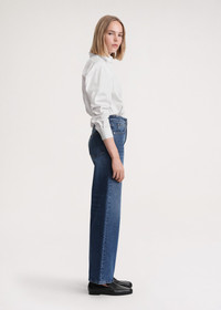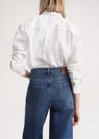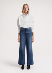 The high waist and wide legs of TOTEME's jeans are a nod to the 1970s. Made in Italy from rigid organic cotton that will soften with each wear, they feature belt loops and five pockets and are fitted on the hips before flaring toward the slightly cropped cuffs. Create a leg-lengthening illusion by styling them with a tucked-in top. Details & Fit - Washed blue - High waist - Zipper fly - Belt loops, five pockets - 100% Organic cotton - 30°C Machine wash - Style number 221-230-741 - The model is 177cm/59 tall and wears a size 27/34 - True to size, slim waist and hips and wide legs