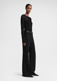 TOTEME evening trousers cut to an extra-long, slim silhouette that flares gently towards the cuffs. They're made from mid-weight crepe with a waistband that sits between the waist and hips and feature belt loops, side and back pockets, and a front zipper. Pair them with a tucked-in top for a leg-lengthening effect. Details & Fit - Black - Belt loops - Side and back pockets - Zipper fly - 70% Viscose, 30% wool - Dry clean - Style number 241-WRB1056-FB0068 - The model is 179cm/5'10" tall and wears a size 36 - True to size, slim thighs