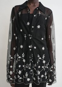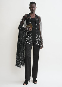 Embroidered with dainty white florals, this TOTEME shirt appeals to the Summer 25 collection's softer side. It is made from sheer tulle to a longline silhouette fastened with mother-of-pearl buttons along the placket. Offset the fabric's transparency by layering it over a top. Details & Fit - Black/white - White floral embroidery - Buttoned placket - Light, sheer, embroidered tulle - 100% polyester recycled - Dry clean - Style number 253-WRT0514-FB0431 - The model is 176cm/59 tall and wears a size 36 - True to size, relaxed silhouette