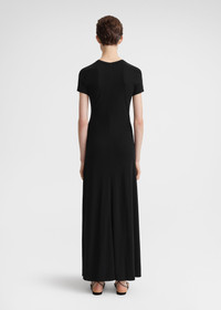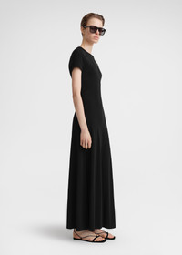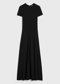 Long TOTEME dress with short raglan sleeves and side seams swooping forward for a sporty feel. It's knitted from fluid mid-weight jersey with a dry hand and fastens with a concealed back zipper. Wear it to grab brunch on the weekend. Details & Fit - Black - Raglan sleeves - Concealed back zipper - 96% viscose, 4% elastane - Cool hand wash - Style number 242-WRD1696-FB0162 - The model is 180cm/5'11 tall and wears a size S - Regular fit, true to size