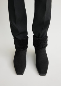 Winter boots exuding an effortless everyday appeal, elevated by the elongated square-toe silhouette. They are made from soft lamb suede entirely lined with furry shearling for warmth and are set on an anti-slip rubber sole. Fold them down to keep the shearling in focus. Details & Fit - Black - Shearling lining - Rubber sole - 100% lamb leather; lining: 100% sheep leather; sole: 100% cow leather - Care instructions and dust bag included - Style number 254-WAS0255-LE0116