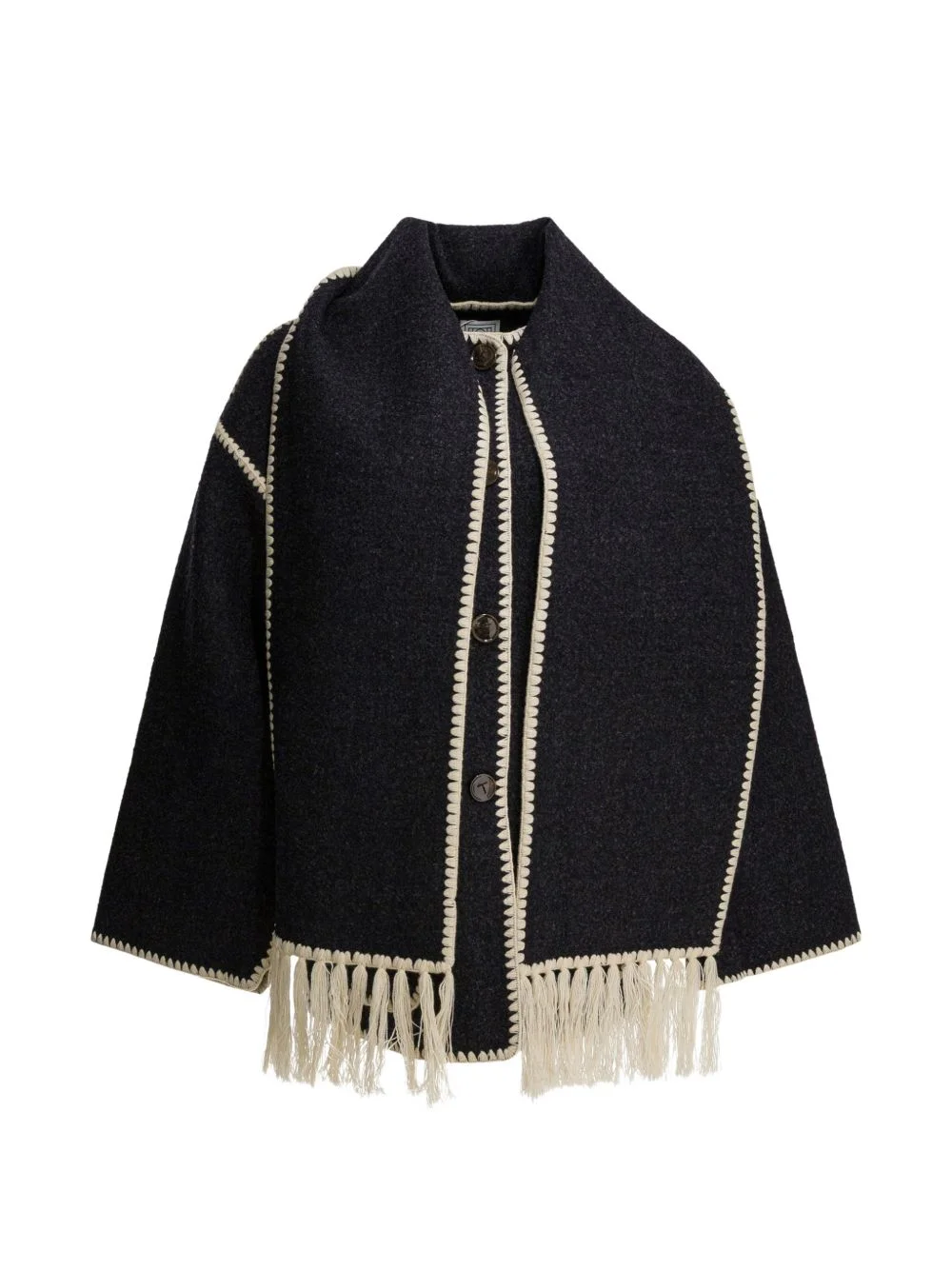 fringe trim coat Highlights - Black - Trimmed edges - Fringe detail - Button fastening - Patch pocket - Wide sleeves Imported Composition Wool 68%, Recycled Leather 20%, Recycled Fabric 12% Washing instructions Read Manufacturer Guidelines