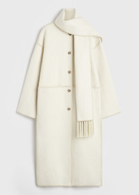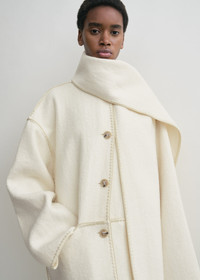 TOTEME Embroidered scarf jacket reworked into an oversized coat with an attached scarf that wraps elegantly around the neck. It is made from a heavyweight wool blend with artisanal blanket stitching and lustrous tassels, then complete with spacious pockets and a buttoned front. Wear it when out and about in the city. Details & Fit - Off-white - Attached scarf, button front - Spacious pockets - High side slits - 68% wool RWS, 20% wool recycled, 12% polyester recycled - Dry clean - Style number 244-WRO0131-FB0292 - Oversized fit, wide sleeves - The model is 176cm/59 tall and wears a size 36