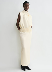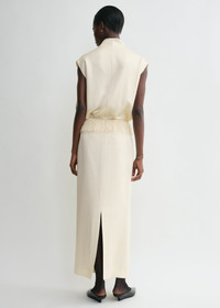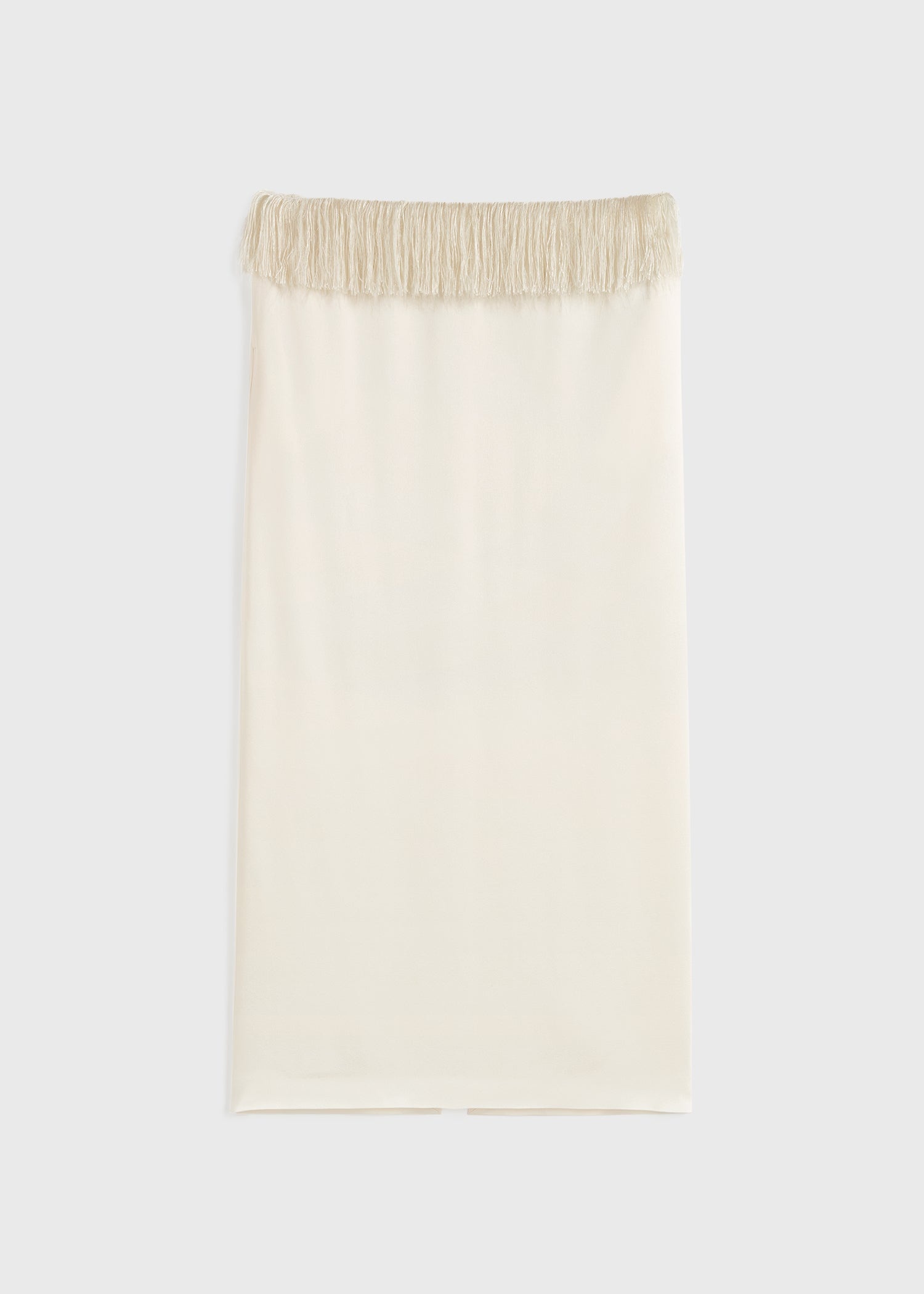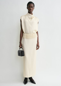 TOTEME skirt cut to a long, straight silhouette decorated with a graceful feather-like fringe at the waist. It is made from gently textured satin impeccably finished with a concealed back zipper, a back vent and full lining. Style it with a coordinating top to attend a social event. Details & Fit - Macadamia - Fringe-trimmed waist - Concealed back zipper, back vent - Tonal lining - 56% viscose, 44% acetate; lining: 100% viscose - Dry clean - Style number 251-WRB0257-FB0344 - The model is 178cm/510 tall and wears a size 36 - True to size, designed to sit on the hips