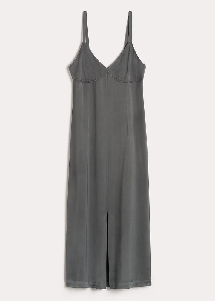 TOTEME cami dress in fluid crepe-back satin with contouring seams for a feminine look. It has front and back darts giving shape to a natural slim silhouette and fastens with a concealed back zipper. Note how the front split shows glimpses of skin as you walk. Details and fit - Lead grey - Concealed back zipper - 100% Viscose - Cool hand wash - The model is 179cm/5’10” tall and wears a size 36 - True to size - Style number 234-WRTWDR042-FB0020
