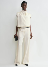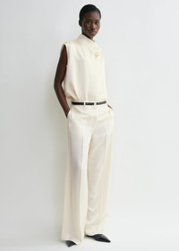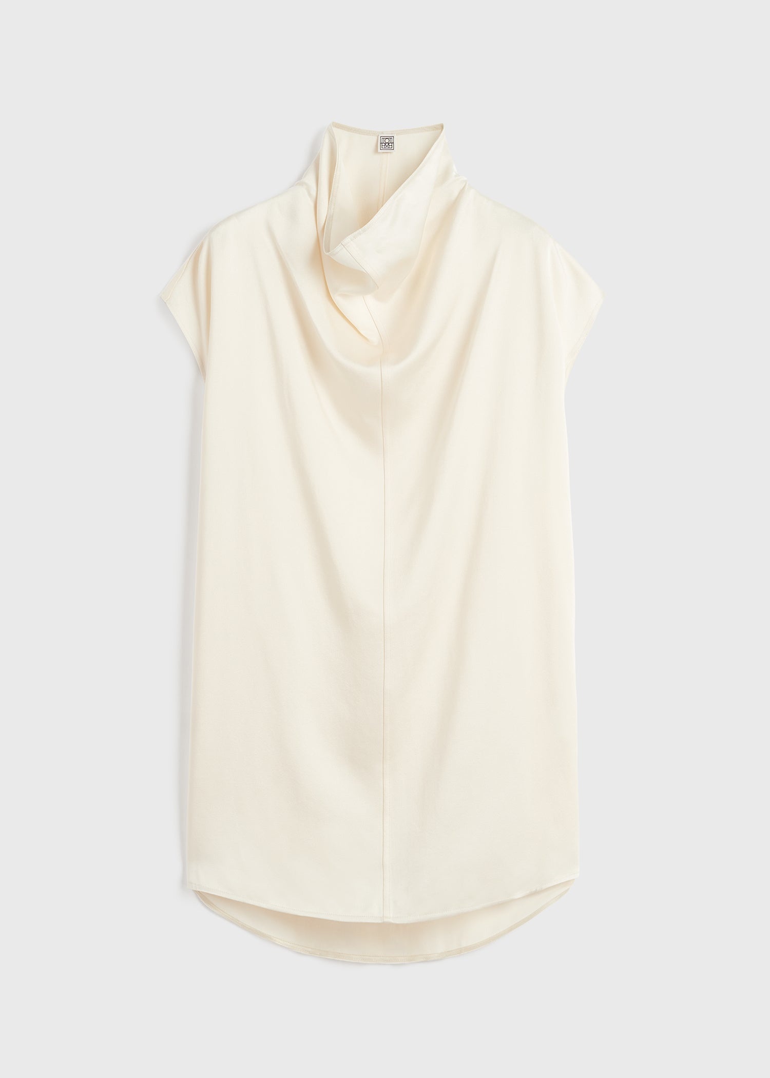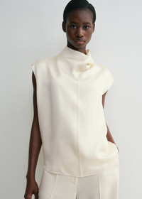Oversized and long TOTEME slip-on top constructed with a funnel neck that slouches effortlessly over a loose-fitting, sleeveless body. Offset the ample silhouette with a belt. Details & Fit - Macadamia - 56% viscose, 44% acetate - Dry clean - Style number 251-WRT0460-FB0344 - The model is 178cm/510 tall and wears a size 36 - True to size, designed with an oversized, long silhouette