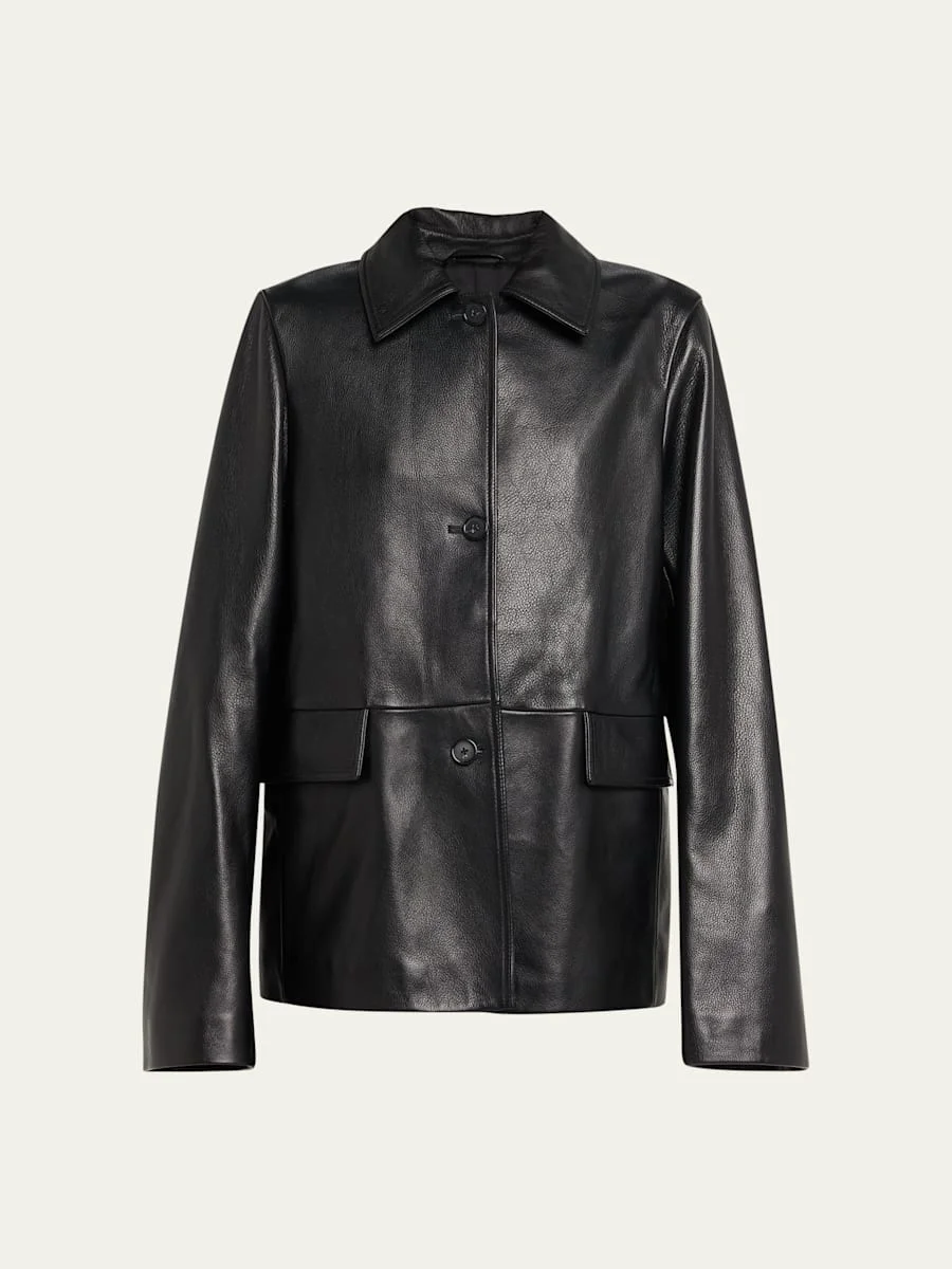 Cut from heavygrained leather, this jacket by Toteme features a straight silhouette for an effortless fit Spread collar; button placket Long sleeves Hip flap pockets Relaxed fit Hip length Leather Leather method dry cleaning Imported