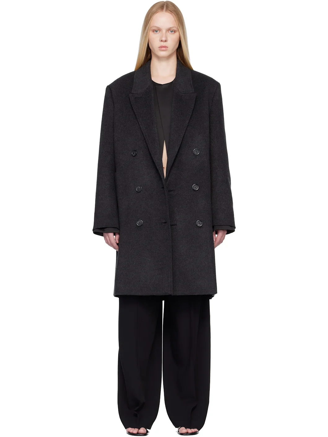 Recycled-blend cashmere melton coat. · Notched lapel · Double-breasted button closure · Welt pockets at front · Button fastening at cuffs · Central vent at back hem · Welt pocket at interior · Full satin lining Supplier color: Charcoal melange Body: 50% recycled cashmere, 50% cashmere. Lining: 100% viscose. Made in Romania 252771F059006