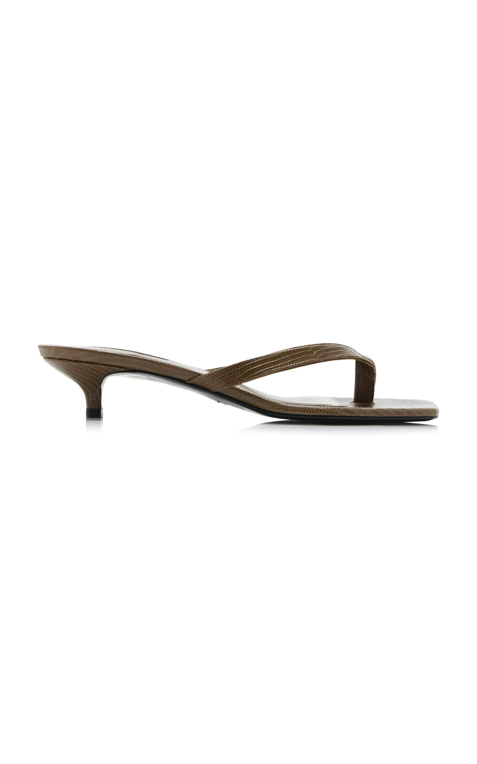 With its signature clean lines and minimalist style, Stockholm-based Toteme is the quintessential Scandi-cool. Elin Kling designs each collection as a modern uniform, looking to vintage pieces for inspiration and giving its cult following a dress code for every day. This flip flop sandal has a square-toe silhouette made from lizard-embossed leather with lightly padded footbeds and kitten heels. PRODUCT DETAILS - Heel height measures 35mm/1.5" - Slip on - Composition: calfskin leather - Made in Italy