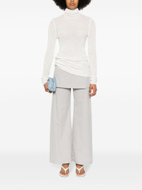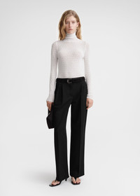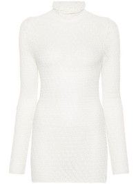 TOTEME sweater knitted with an open crochet pattern that feels modern and fresh. It has a stretchy slim silhouette with an unstructured high neck and long sleeves. Layer it over a tank to offset the see-through look. Details & Fit - Off white - 83% viscose, 17% polyamide - Dry clean - Style number 242-WRT1776-YA0040 - The model is 179cm/5'10" tall and wears a size S - Slim fit, true to size