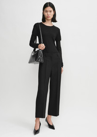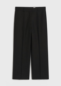 Cropped TOTEME trousers tailored from recycled polyester and certified wool fibers to match our signature Double-breasted blazer. They have a flattering silhouette with a mid waist followed by long, straight legs set with belt loops, a zipper fly, side and back pockets. Add a tank top for a casual meeting. Details & Fit - Black - Belt loops - Side and back pockets - Zipper fly - 55% recycled polyester, 45% wool RWS - Dry clean - Style number 243-WRB4511-FB0026 - The model is 181cm/5'11 tall and wears a size 36 - True to size, straight legs
