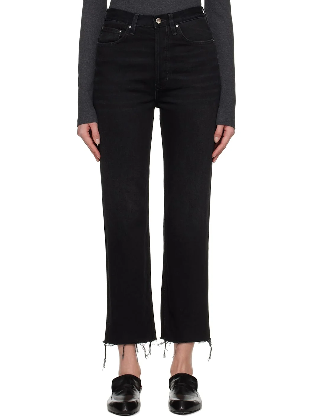 Slim-fit and straight-leg non-stretch organic cotton denim jeans. Fading and whiskering throughout. · Mid-to-high rise · Belt loops · Five-pocket styling · Button-fly · Cropped legs · Frayed edge at cuffs · Logo patch at back waistband Supplier color Faded black 100% organic cotton. Made in Italy 251771F069007