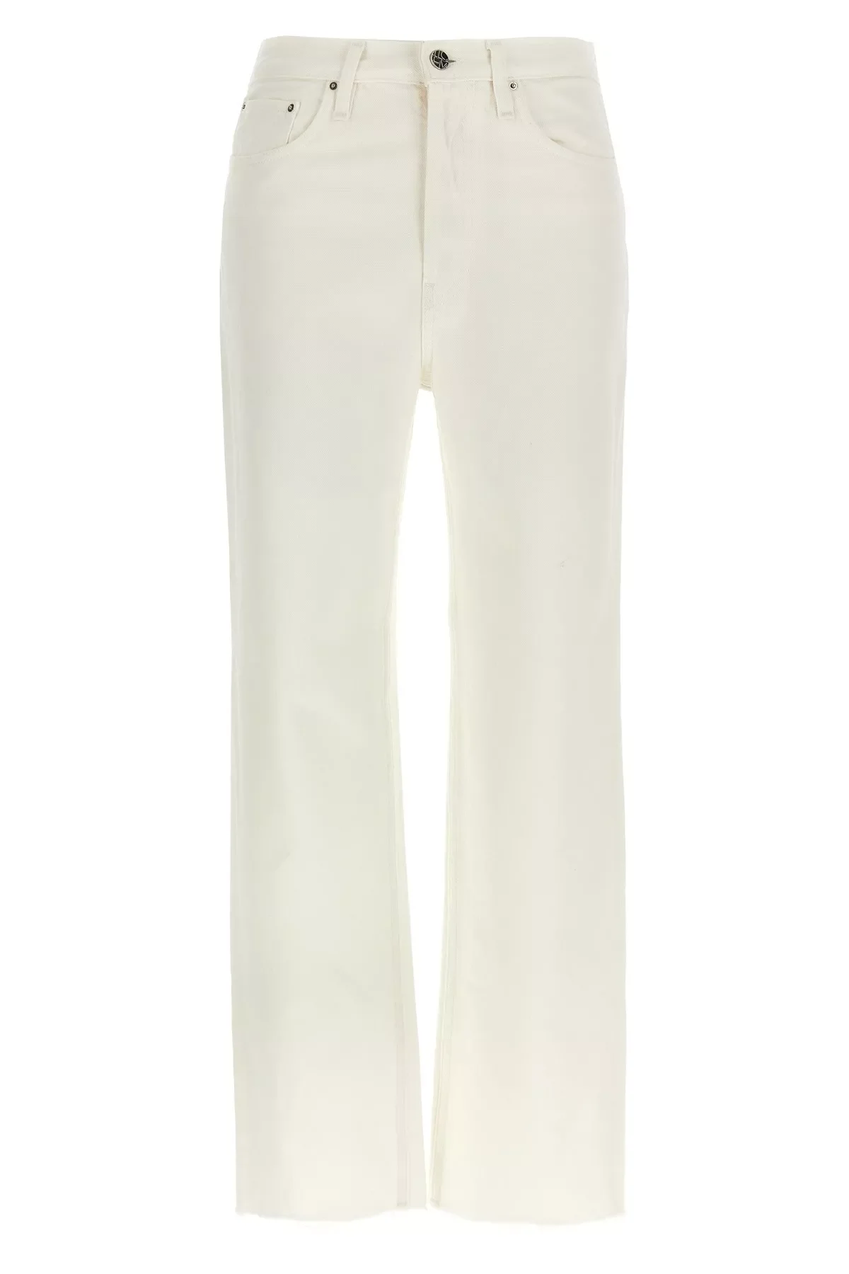 cod. 222235748110 High-waisted cotton denim jeans with straight leg, five pockets, button closure, raw cut leg bottoms, and leather logo label on the back. Color: White Size & Fit: true to size fit Composition: 100% cotton Made in: Italy