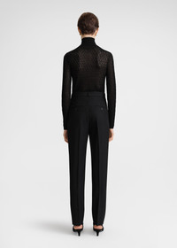 High-waist TOTEME trousers crafted with a small front pleat and tapered legs. They're made from a lightweight blend of certified wool and recycled polyester and have belt loops, side and back pockets, and a hook and zipper fly. Complete an elegant edit with a high-neck top. Details & Fit - Black - Belt loops - Side and back pockets - Zipper fly - 55% polyester recycled, 45% wool RWS - Dry clean - Style number 242-WRB1621-FB0026 - The model is 179cm/5'10" tall and wears a size 36 - Regular fit, true to size