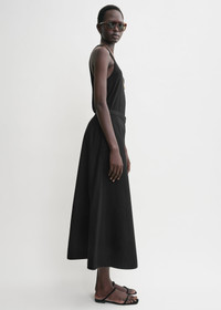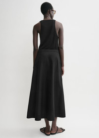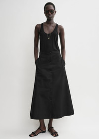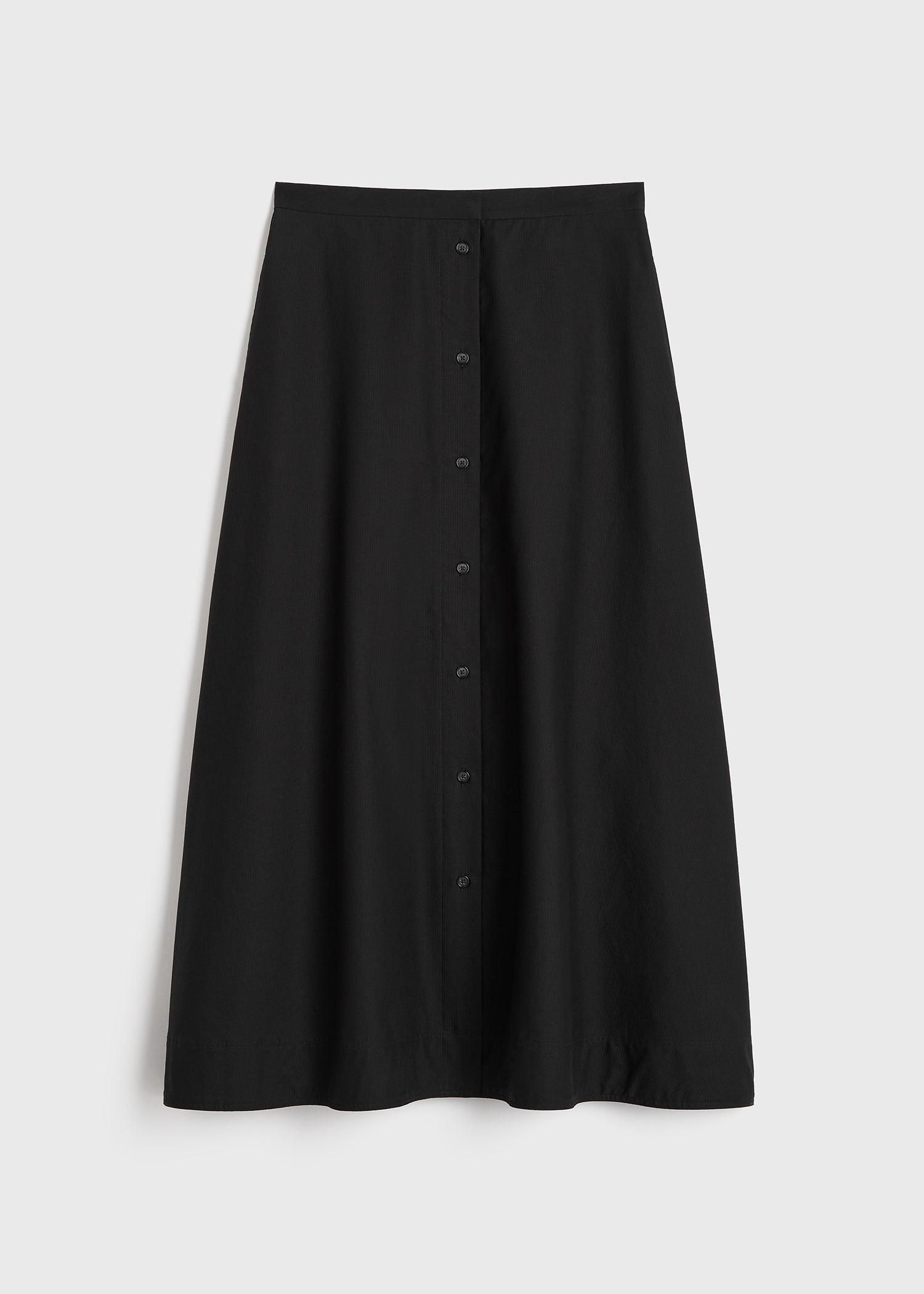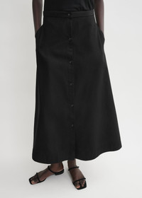 TOTEME midi skirt woven from organic cotton with subtle jacquard stripes. It has a mid-high waist and an ankle-grazing A-line silhouette that fastens with top-to-bottom buttons and is fitted with pockets. Wear it to have lunch in the city or during a coastal vacation. Details & Fit - Black - Button front - Side pockets - 100% organic cotton - 30°C Machine wash - Style number 243-WRB0200-FB0212 - The model is 180cm/511 tall and wears a size 36 - True to size, regular fit