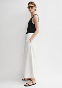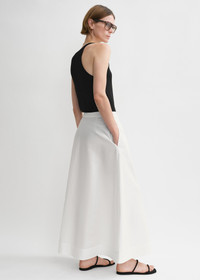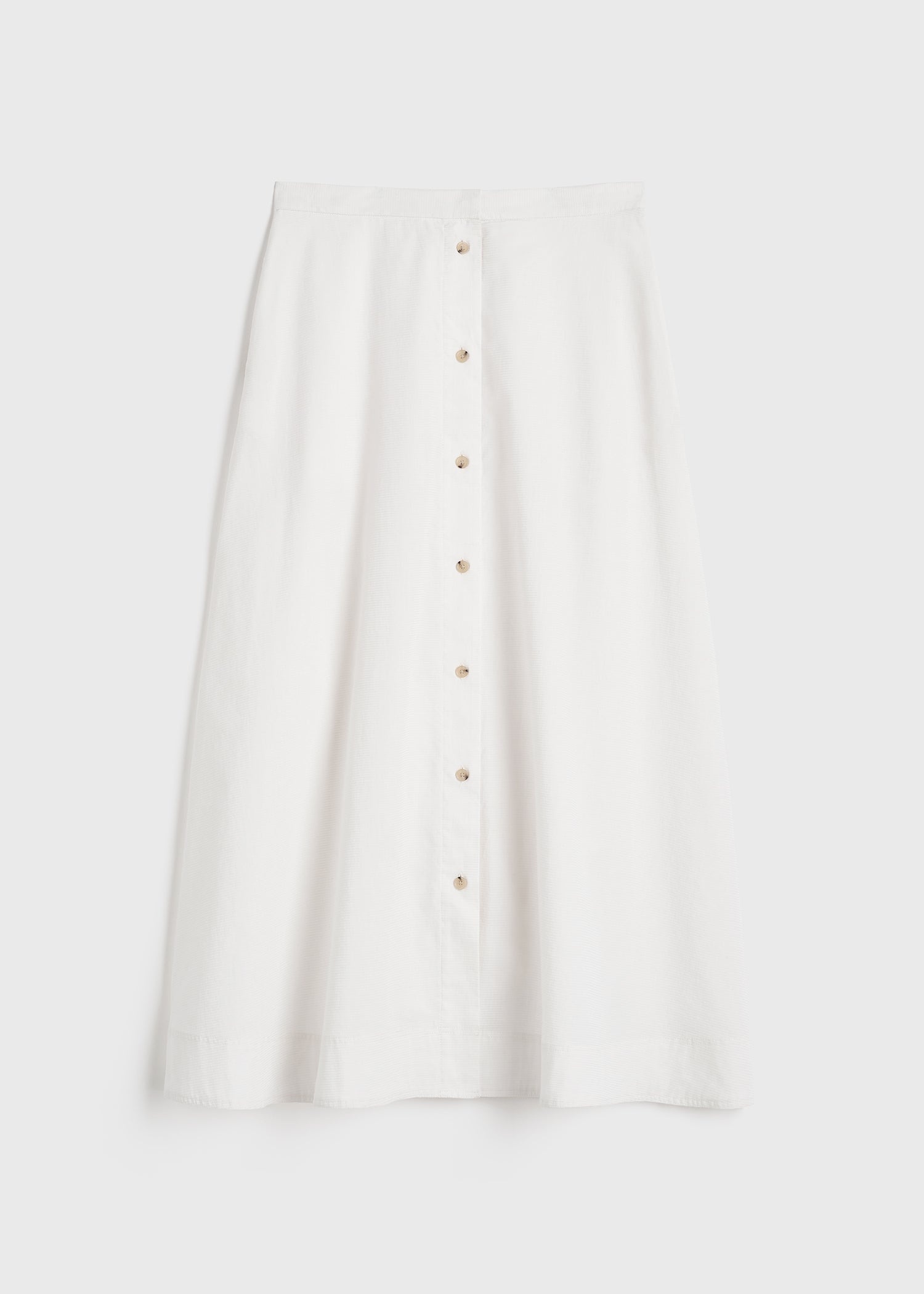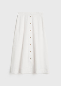 TOTEME midi skirt woven from organic cotton with subtle jacquard stripes. It has a mid-high waist and an ankle-grazing A-line silhouette that fastens with top-to-bottom buttons and is fitted with pockets. Wear it to have lunch in the city or during a coastal vacation. Details & Fit - White - Button front - Side pockets - 100% organic cotton - 30°C Machine wash - Style number 243-WRB0200-FB0212 - The model is 176cm/59 tall and wears a size 36 - True to size, regular fit