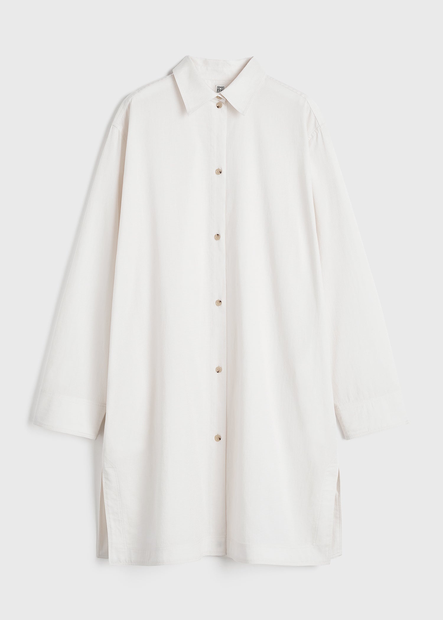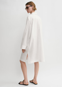 Oversized TOTEME tunic shirt which can be worn as a shirtdress or cover up with city and resort looks. It is made from organic cotton woven with jacquard stripes and has a buttoned front, practical slip pockets and side slits. Team it with sandals for lunch. Details & Fit - White - Button front - Side pockets - 100% organic cotton - 30°C Machine wash - Style number 243-WRT0340-FB0212 - The model is 176cm/59 tall and wears a size 36 - Oversized fit