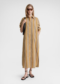 Tunic-style TOTEME shirtdress accented with caramel, cornsilk, black and white jacquard stripes for a graphic effect. It's made from a light and fresh cotton blend with a button placket, chest and side pockets and hem slits for ease of movement. Add a bag and sandals to complete a high-summer look. Details & Fit - Caramel, cornsilk, black and white stripes - Buttoned placket and cuffs - Chest and side pockets - 85% cotton, 15% polyamide - 30°C Machine wash - Style number 242-WRD1752-FB0117 - The model is 178cm/510 tall and wears a size 36 - Relaxed fit, true to size