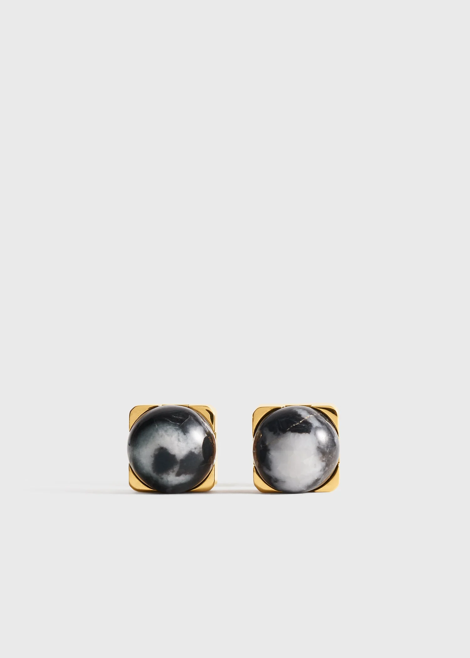 TOTEME stud earrings conceived with a modern square frame that takes the shape of a pill when seen in profile. They are handcrafted in Italy from 18kt gold-plated brass set with black and white jasper stones with a natural marbled effect and fasten with a classic post back. Details & Fit - Black and white jasper - Post-back fastening - 100% brass plated in 0,5 microns of 18kt yellow gold and 0,5 microns of palladium; 100% natural jasper - Care instructions and protective packaging included - Please note that jasper is a natural stone, therefore its black and white pattern may vary from piece to piece - Style number 243-WJQ0033-JA0003 - Height 8mm - Depth 19.5 mm - Ears must be pierced - Our jewelry is handmade any difference in color or finishing is a statement of the manual craftsmanship behind each piece. - We use a vibratory tumbling machine to achieve an intentional pre-loved and timeless look - This piece contains jasper any difference in color or pattern is the result of the stone's natural imperfections</ul>