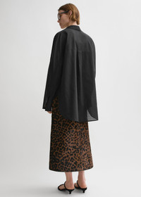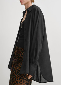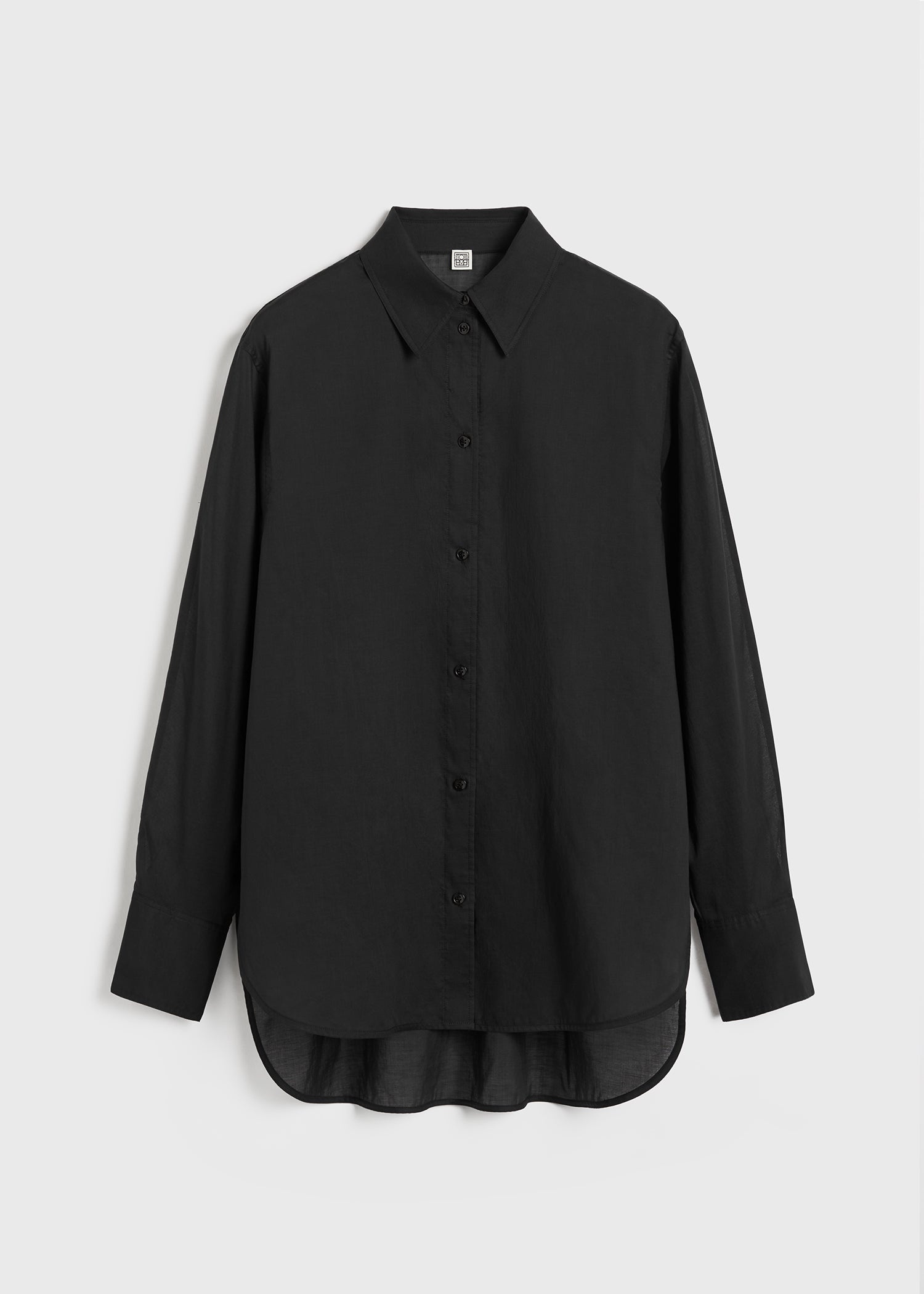 TOTEME shirt skillfully constructed with a back yoke that expands into kimono-style sleeves. It is woven from diaphanous organic cotton and Lyocell to an oversized, longline cocoon shape with a dramatically stepped hem. Wear it as an overshirt over a tank top. Details & Fit - Black - Buttoned placket and cuffs - 50% cotton organic, 50% Lyocell - Hand wash - Style number 243-WRT2522-FB0238 - The model is 176cm/59 tall and wears a size 36 - Oversized fit, spacious armholes