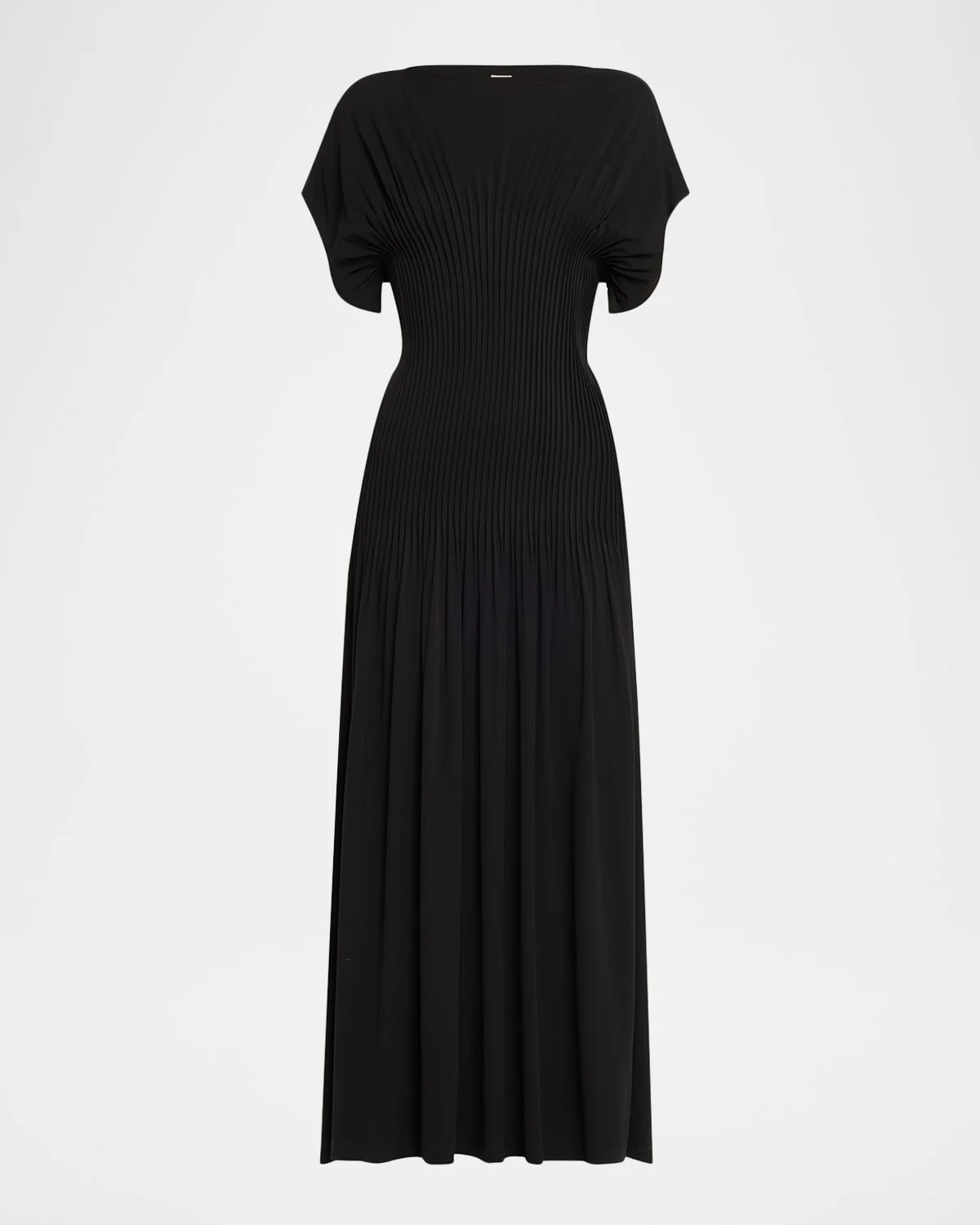 Toteme midweight jersey dress featuring delicate knife pleats that expand into the capped sleeves and long skirt High neckline Short sleeves Empire waist Full length Aline silhouette Slipover style Dry clean Imported