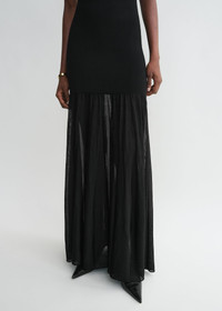 TOTEME tank dress reimagined as an understated evening piece. Made from compact stretch jersey, it has a tank top-inspired neckline followed by a slim waist and hips and a sheer floor-length skirt with a soft plisse finish. Choose classic jewelry as a sophisticated complement. Details & Fit - Black - 89% viscose, 11% polyamide - Cool hand wash - Style number 251-WRD0180-YA0138 - The model is 178cm/510 tall and wears a size S - True to size, slim fit