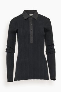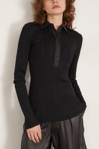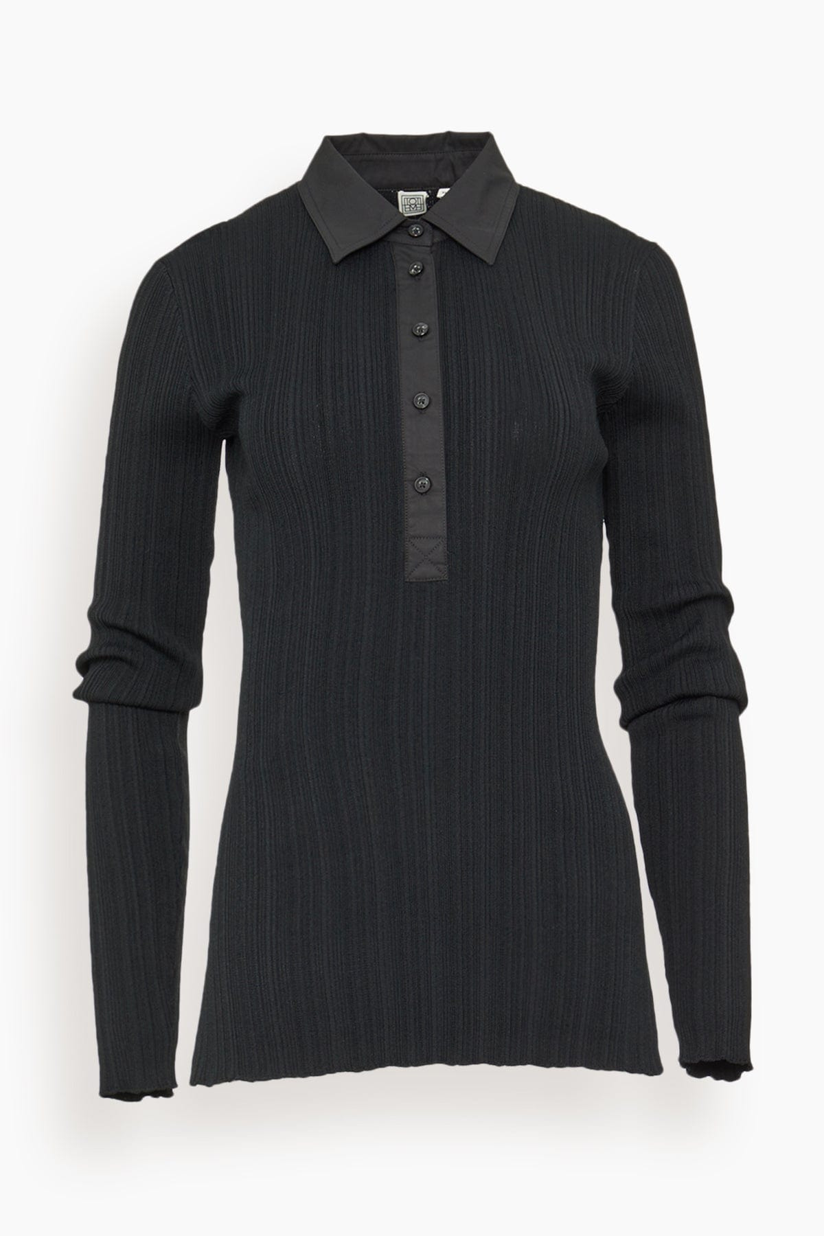 The Toteme Half-Placket Knit Shirt is decorated with shirting elements, including a collar and a buttoned half placket. It is knitted from a ribbed fabric crafted from Naia™ cellulose, an innovative fiber originating from responsibly sourced wool pulp. Wear it with jeans to catch a movie. FIT DETAILS - Black - Poplin collar and buttoned half placket - 82% Naia™ acetate, 18% polyamide - Cool hand wash