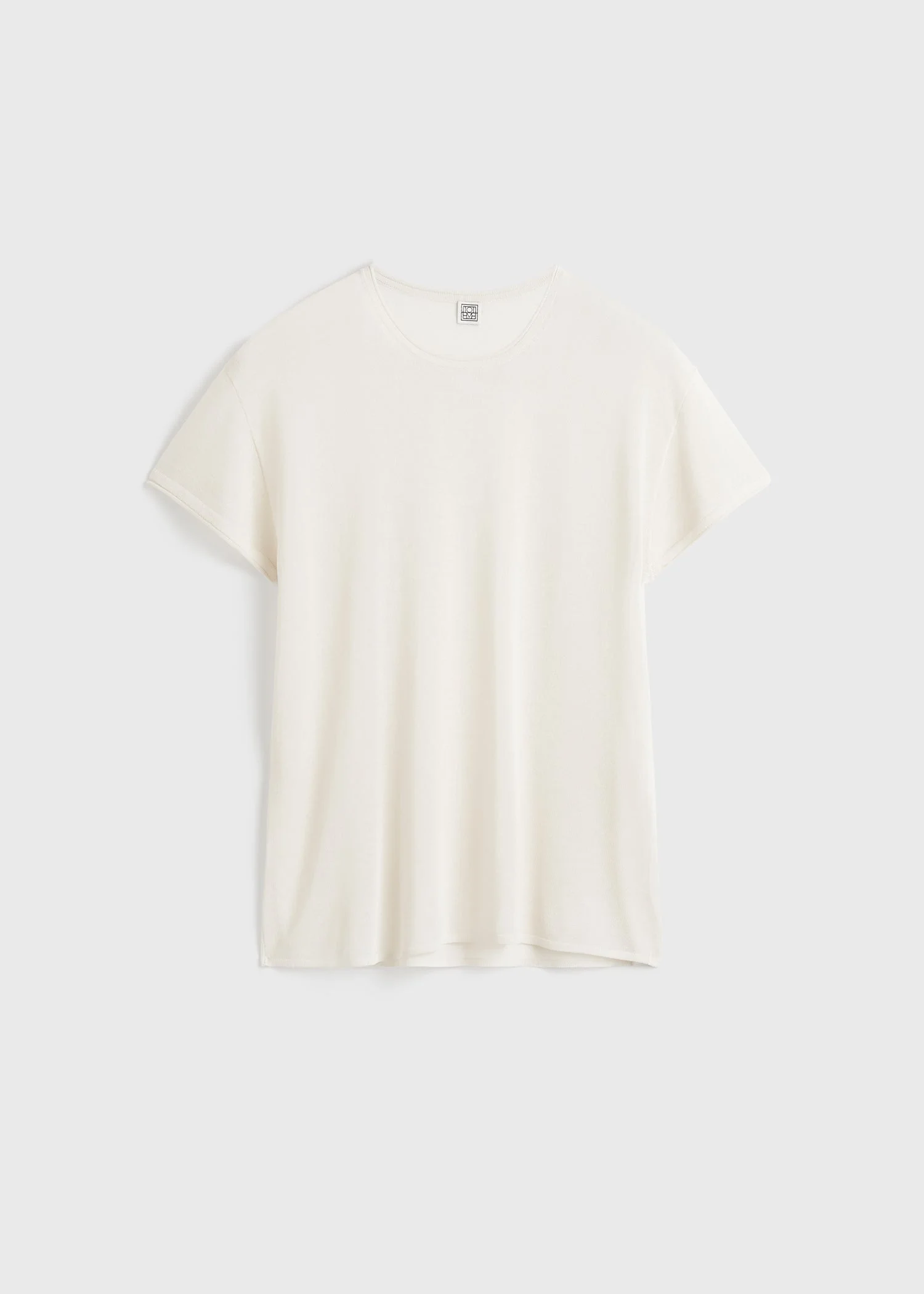 Designer’s note: “This TOTEME Garderob piece marries the ease of a classic tee with the refinement of a silk fabric finished with minimalist rolled edges. Here we style it with jeans and pumps for a modern take on everyday dressing.” Details & Fit - Ecru - Rolled edges - Light, semi-sheer silk crepe - 100% silk - Cool hand wash - Style number 252-WRT0476-YA0173 - The model is 181cm/511 tall and wears a size S - True to size, regular fit and spacious short sleeves with dropped shoulders
